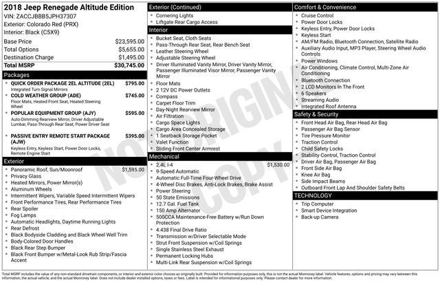 TEXT US - 1(262)671-1022.** LOCAL TRADE ** ACCIDENT FREE AUTOCHECK ** ALTITUDE PACKAGE ** 2.4L I4 ** PANORAMIC POWER SUNROOF ** COLD WEATHER GROUP **2018 Jeep Renegade 4D Sport Utility AltitudeColorado Red4WD 9-Speed 948TE Automatic 2.4L I4**ONE OWNER**, **ACCIDENT FREE AUTOCHECK**, **LOCAL TRADE**, **SUNROOF/MOONROOF**, **4WD**, **HEATED SEATS**, 115V Auxiliary Power Outlet, 40/20/40 Rear Seat w/Trunk Pass-Thru, All-Season Floor Mats, Altitude Package, Auto-Dimming Rear-View Mirror, Black Accent Stitching, Black Day Light Opening Moldings, Cold Weather Group, Deluxe Cloth High-Back Bucket Seats, Dual-Pane Panoramic Power Sunroof, Exterior Mirrors w/Supplemental Signals, Gloss Black Badging, Gloss Black Instrument Panel Bezels, Gloss Black Rear Fascia Applique, Heated Front Seats, Heated Steering Wheel, ParkView Rear Back-Up Camera, Passive Entry Remote Start Package, Passive Entry/Keyless Go, Popular Equipment Group, Power 4-Way Driver Lumbar Adjust, Power 8-Way Driver Manual 4-Way Passenger Seats, PTC Auxiliary Interior Heater, Quick Order Package 2EL Altitude, Vinyl Door Trim Panel, Wheels: 18 x 8.0 Gloss Black, Windshield Wiper De-Icer.Recent Arrival! 21/29 City/Highway MPGAwards:* 2018 KBB.com 10 Best All-Wheel-Drive Vehicles Under $25,000 * 2018 KBB.com 10 Best All-Wheel-Drive Vehicles Under $30,000 * 2018 KBB.com 10 Coolest New Cars Under $20,000 * 2018 KBB.com 10 Most Awarded Brands