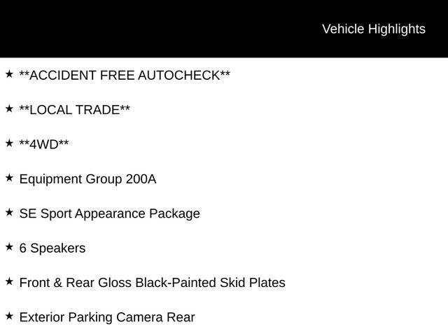 **ACCIDENT FREE AUTOCHECK**, **LOCAL TRADE**, **4WD**, 4WD, 6 Speakers, Black Beltline Molding, Black Roof-Rack Side Rails, Equipment Group 200A, Exterior Parking Camera Rear, Front & Rear Gloss Black-Painted Skid Plates, Front fog lights, Fully automatic headlights, Gloss Black-Painted Sideview Mirror Caps, Gloss Black-Painted Upper Grille Bars & Plinth, Halogen Projector Headlamps w/Black Bezels, Heated Partial Leather Front Sport Bucket Seats, Leather-Wrapped Steering Wheel & Shift Knob, SE Sport Appearance Package, Security system, Taillamps w/Black Bezel, Wheels: 19 Premium Ebony Black-Painted Aluminum.