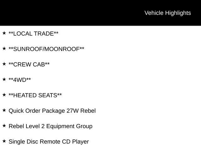 **LOCAL TRADE**, **SUNROOF/MOONROOF**, **CREW CAB**, **4WD**, **HEATED SEATS**, 115V Auxiliary Rear Power Outlet, 2 USB Full Function/Charge Only Media Hub, Auto-Dimming Rear-View Mirror, Black Premium Power Mirrors, Body Color Door Handles, Dome Dual LED Reading Lamp, Dual-Pane Panoramic Sunroof, Foam Bottle Insert (Door Trim Panel), Heated Front Seats, Heated Steering Wheel, Overhead LED Lamps, ParkSense Front/Rear Park Assist w/Stop, Power Adjustable Pedals, Premium Overhead Console, Quick Order Package 27W Rebel, Radio: Uconnect 4 w/8.4 Display, Rain Sensitive Windshield Wipers, Rear Dome w/On/Off Switch Lamp, Rear Underseat Compartment Storage, Rear Window Defroster, Rebel Level 2 Equipment Group, Remote Proximity Keyless Entry, Security Alarm, Single Disc Remote CD Player, Sun Visors w/Illuminated Vanity Mirrors, Universal Garage Door Opener.