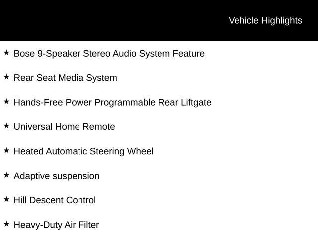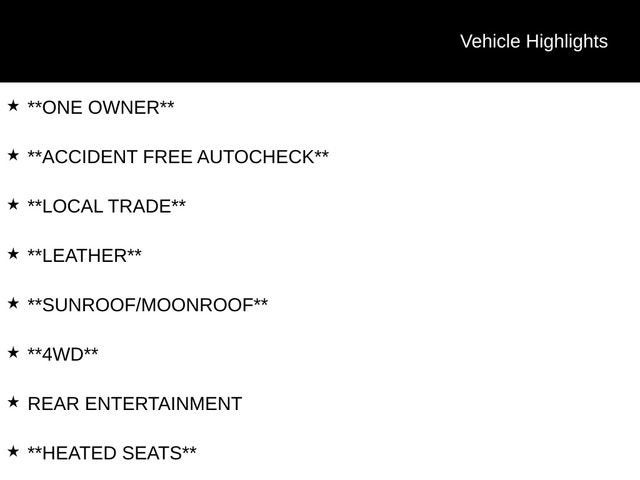 **ONE OWNER**, **ACCIDENT FREE AUTOCHECK**, **LOCAL TRADE**, **LEATHER**, **SUNROOF/MOONROOF**, **4WD**, REAR ENTERTAINMENT, **HEATED SEATS**, 4WD, 12-Way Power Seat Adjusters, 15 Diagonal Multi-Color Head-Up Display, 2 Presets For Outside Rearview Mirrors, 3rd Row 60/40 Power-Folding Split-Bench Seat, Adaptive suspension, Black Roof-Mounted Luggage Rack Side Rails, Bose 9-Speaker Stereo Audio System Feature, Bright Front & Rear Door Sill Plates, Extra Capacity Cooling System, Front High-Approach Angle Fascia, Hands-Free Power Programmable Rear Liftgate, HD Radio, HD Surround Vision, Heated & Ventilated Driver & Front Passenger Seats, Heated 2nd Row Outboard Position Seats, Heated Automatic Steering Wheel, Heated Driver & Front Passenger Seats, Heavy-Duty Air Filter, Hill Descent Control, Inside Rear-View Auto-Dimming Mirror, License Plate Front Mounting Package, Max Trailering Package, Outside Heated Power-Adjustable Mirrors, Power Release 2nd Row 60/40 Split-Folding Bench Seat, Power Tilt & Telescopic Steering Column, Preferred Equipment Group 4SB, Radio: AM/FM/SiriusXM w/Navigation, Rear Media & Nav Package, Rear Pedestrian Alert, Rear Seat Media System, Red Horizontal-Mounted Recovery Hooks, Safety Alert Seat, SiriusXM w/360L, Technology Package, Universal Home Remote.
