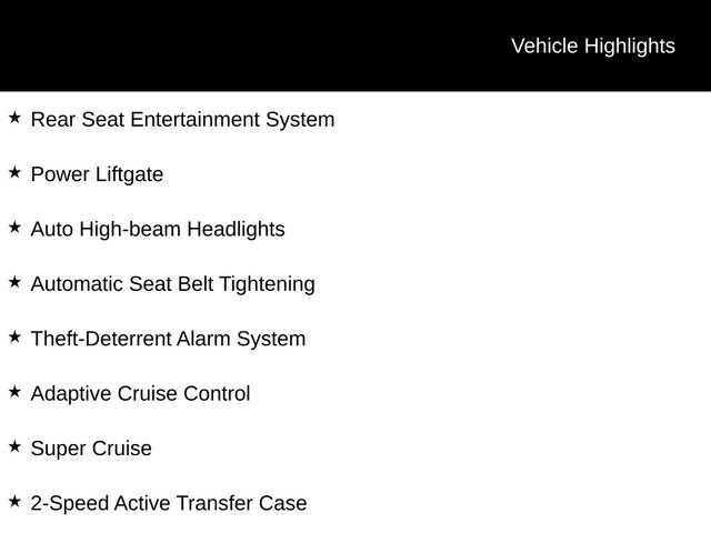 **ONE OWNER**, **ACCIDENT FREE AUTOCHECK**, **LOCAL TRADE**, **LEATHER**, **SUNROOF/MOONROOF**, **4WD**, **HEATED SEATS**, 4WD, 2-Speed Active Transfer Case, Adaptive Cruise Control, Air Ride Adaptive Suspension, AKG Studio Reference 36-Speaker Audio System, Auto High-beam Headlights, Automatic Seat Belt Tightening, Automatic Stop/Start, Body-Color Door Handles, Door Lock & Latch Shields, Electronic Limited-Slip Differential, Enhanced Automatic Emergency Braking, Enhanced Automatic Parking Assist, Extra Capacity Cooling System, Floor Console w/Covered Storage, Front Auxiliary 12-volt Power Outlet, Glass Breakage Sensor, Heated & Ventilated Driver & Front Passenger Seats, Heavy-Duty Trailering Package, Hitch Guidance w/Hitch View, Illuminating Front & Rear Sill Plates, Integrated Trailer Brake Controller, Night Vision, Platinum Interior Trim, Power Liftgate, Power Lumbar Massage Driver Seat, Power Lumbar Massage Front Passenger Seat, Power Panoramic Tilt-Sliding Sunroof, Preferred Equipment Group 1SH, Rear Camera Mirror, Rear Camera Mirror Washer, Rear Cross Traffic Alert, Rear Seat Entertainment System, Reconfigurable Full-Color Head-Up Display, Reverse Automatic Braking, Running Board Assist Steps, Smart Trailer Integration Indicator, Soft Closing Front & Rear Doors, Start/Stop System Disable Button, Super Cruise, Theft-Deterrent Alarm System, Touring Package, Trailer Side Blind Zone Alert, Trailer Tire Pressure Monitoring System, Trailering Assist Guidelines, Vehicle Inclination Sensor, Vehicle Interior Movement Sensor, Wired Auxiliary Trailer Camera (LPO).