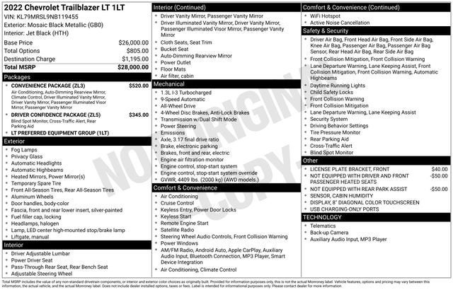 TEXT US - 1(262)671-1022.** LOCAL TRADE ** CLEAN AUTOCHECK ** NEW TIRES ** ALL WHEEL DRIVE ** LT TRIM ** DRIVER CONFIDENCE PACKAGE ** CONVENIENCE PACKAGE **2022 Chevrolet TrailBlazer 4D Sport Utility LTMosaic Black MetallicAWD 9-Speed Automatic 1.3L Ecotec Turbo DOHC SIDI w/VVT**ONE OWNER**, **ACCIDENT FREE AUTOCHECK**, **LOCAL TRADE**, **AWD**, 1 Type-A & 1 Type-C USB Charging-Only Ports, 120-Volt Power Outlet, 6-Speaker Audio System Feature w/Amplifier, 8-Way Power Driver Seat Adjuster, 8 Diagonal Color Touchscreen Display, Cabin Humidity Sensor, Convenience Package, Driver & Front Passenger Illuminated Vanity Mirrors, Driver Confidence Package, Inside Rear-View Auto-Dimming Mirror, Lane Change Alert w/Side Blind Zone Alert, Preferred Equipment Group 1LT, Rear Cross Traffic Alert, Rear Park Assist, Single-Zone Auto Climate Control Air Conditioning, Steering wheel mounted audio controls.Recent Arrival! 26/30 City/Highway MPGAwards:* 2022 IIHS Top Safety Pick+