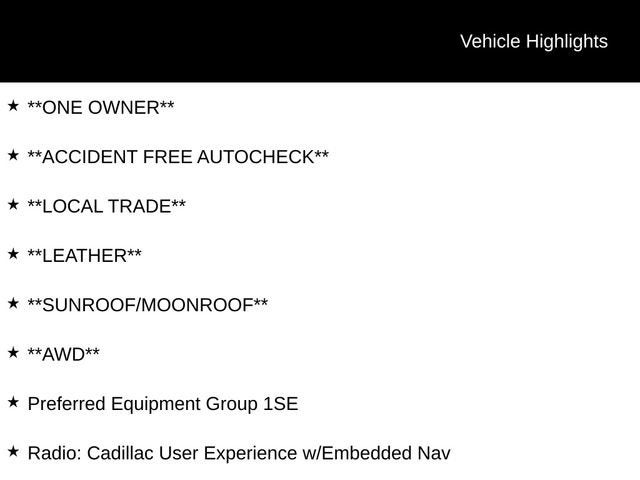**ONE OWNER**, **ACCIDENT FREE AUTOCHECK**, **LOCAL TRADE**, **LEATHER**, **SUNROOF/MOONROOF**, **AWD**, 2-Way Driver Seat Power Lumbar Control, 2-Way Passenger Seat Power Lumbar Control, 4-Way Driver Seat Power Lumbar Control, 4-Way Passenger Seat Power Lumbar Control, 4.2 Diagonal Color Display Driver Info Center, 6-Way Power Passenger Seat Adjuster, Automatic Emergency Braking, Bose Centerpoint Surround Sound 13-Speaker System, Cold Weather Package, Comfort & Convenience Package, Electronic Cruise Control w/Set & Resume Speed, Front & Rear Park Assist, HD Radio, HD Rear Vision Camera, Heated Driver & Front Passenger Seats, Heated Rear Outboard Seating Positions, Heated Steering Wheel, Power Lumbar Massage Driver Seat, Power Lumbar Massage Front Passenger Seat, Preferred Equipment Group 1SE, Radio: Cadillac User Experience w/Embedded Nav, Ventilated Driver & Front Passenger Seats, Wireless Apple CarPlay/Wireless Android Auto.