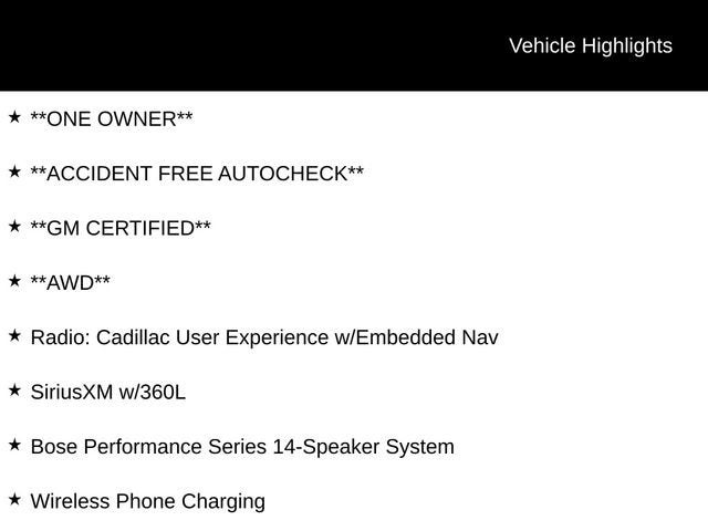 **ONE OWNER**, **ACCIDENT FREE AUTOCHECK**, **GM CERTIFIED**, **AWD**, Bose Performance Series 14-Speaker System, Radio: Cadillac User Experience w/Embedded Nav, SiriusXM w/360L, Wireless Apple CarPlay/Wireless Android Auto, Wireless Phone Charging.