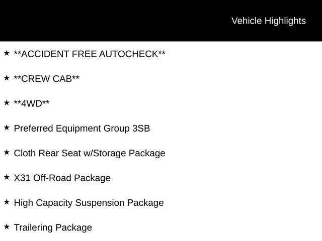 **ACCIDENT FREE AUTOCHECK**, **CREW CAB**, **4WD**, 10-Speed Automatic, 4WD, Jet Black Cloth, 120-Volt Bed Mounted Power Outlet, 120-Volt Interior Power Outlet, 2 Charge/Data USB Ports, 2 Type-C Charge-Only Rear USB Ports, 6-Speaker Audio System Feature, Auto-Locking Rear Differential, Body Color Header w/Gloss Black Mesh Grille Bars, Cloth Rear Seat w/Storage Package, Color-Keyed Carpeting Floor Covering, Deep-Tinted Glass, Dual Exhaust System, Electric Rear-Window Defogger, Front Frame-Mounted Black Recovery Hooks, Front Rubberized-Vinyl Floor Mats, HD Rear Vision Camera, Heavy-Duty Air Filter, High Capacity Suspension Package, Hill Descent Control, Hitch Guidance, Integrated Trailer Brake Controller, Keyless Open & Start, LED Cargo Area Lighting, Manual Tilt-Wheel & Telescoping Steering Column, Off-Road Suspension, OnStar Services Capable, Power Door Locks, Power Front Windows w/Driver Express Up/Down, Power Front Windows w/Passenger Express Down, Power Rear Windows w/Express Down, Power Sunroof, Preferred Equipment Group 3SB, Push Button Start, Rear Rubberized-Vinyl Floor Mats, Rear Wheelhouse Liners, Remote Vehicle Starter System, SiriusXM w/360L Trial Subscription, Steering Wheel Audio Controls, Theft Deterrent System (Unauthorized Entry), Trailering Package, Wi-Fi Hotspot Capable, X31 Hard Badge, X31 Off-Road Package.